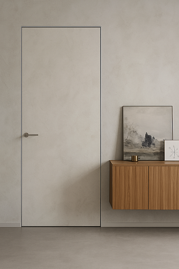 Дверь под покраску в скрытом коробе с алюминиевой кромкой. Система REVERSE - внутреннее открывание двери